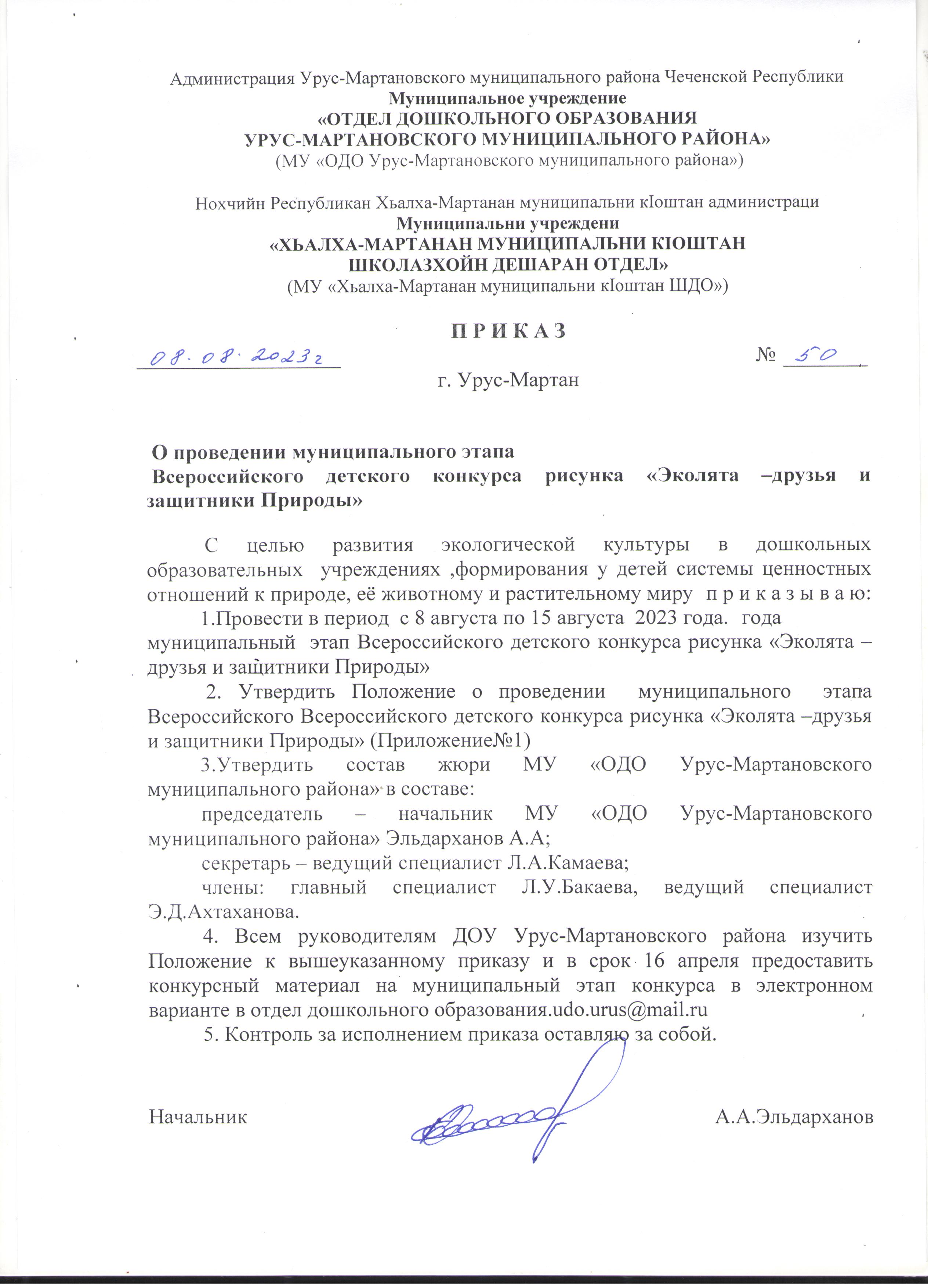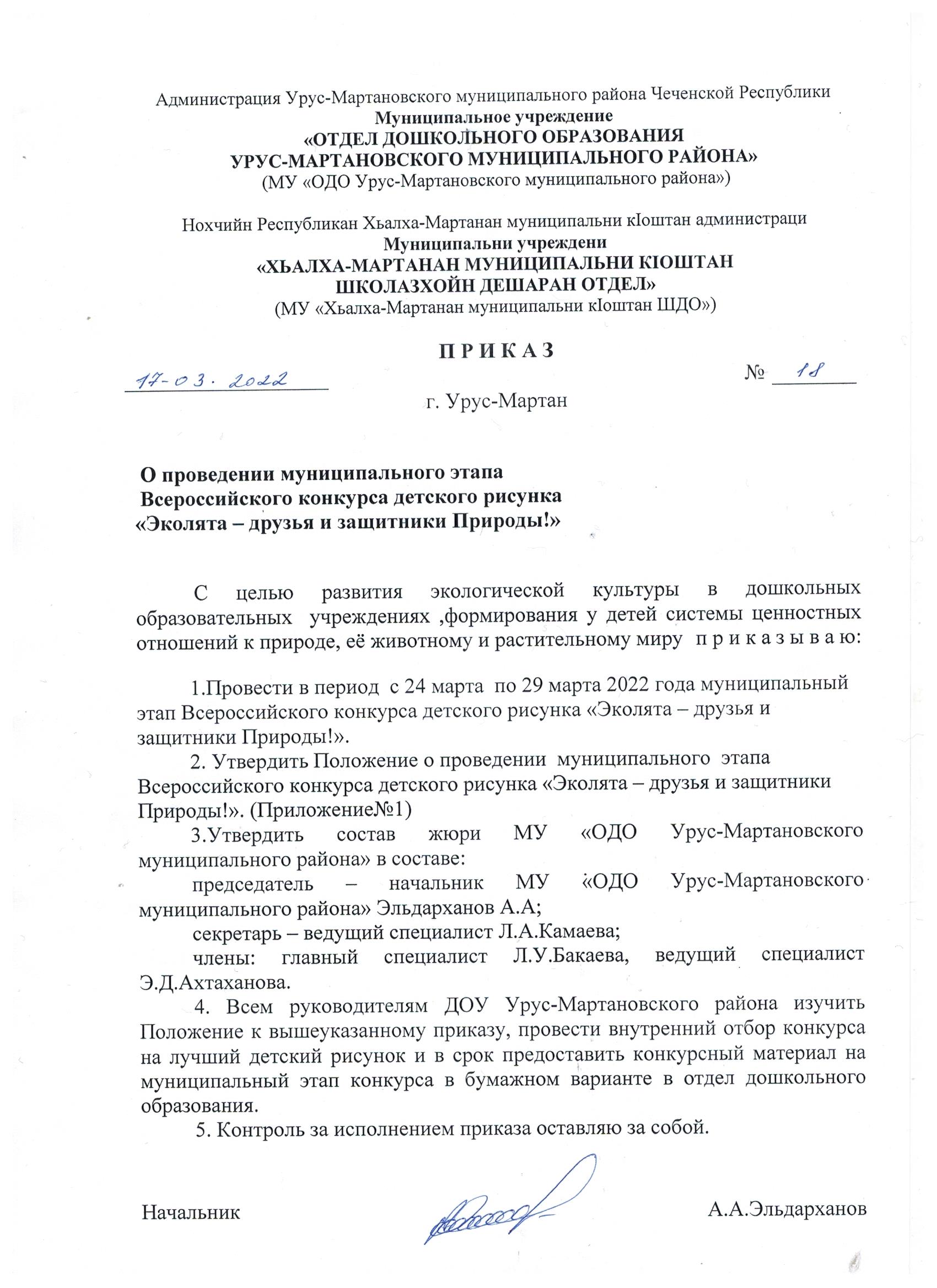 Приказ о проведении муниципального этапа конкурса «Нохчийн мотт – берийн ирсе кхане»